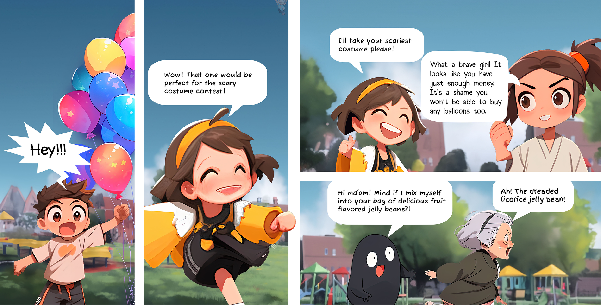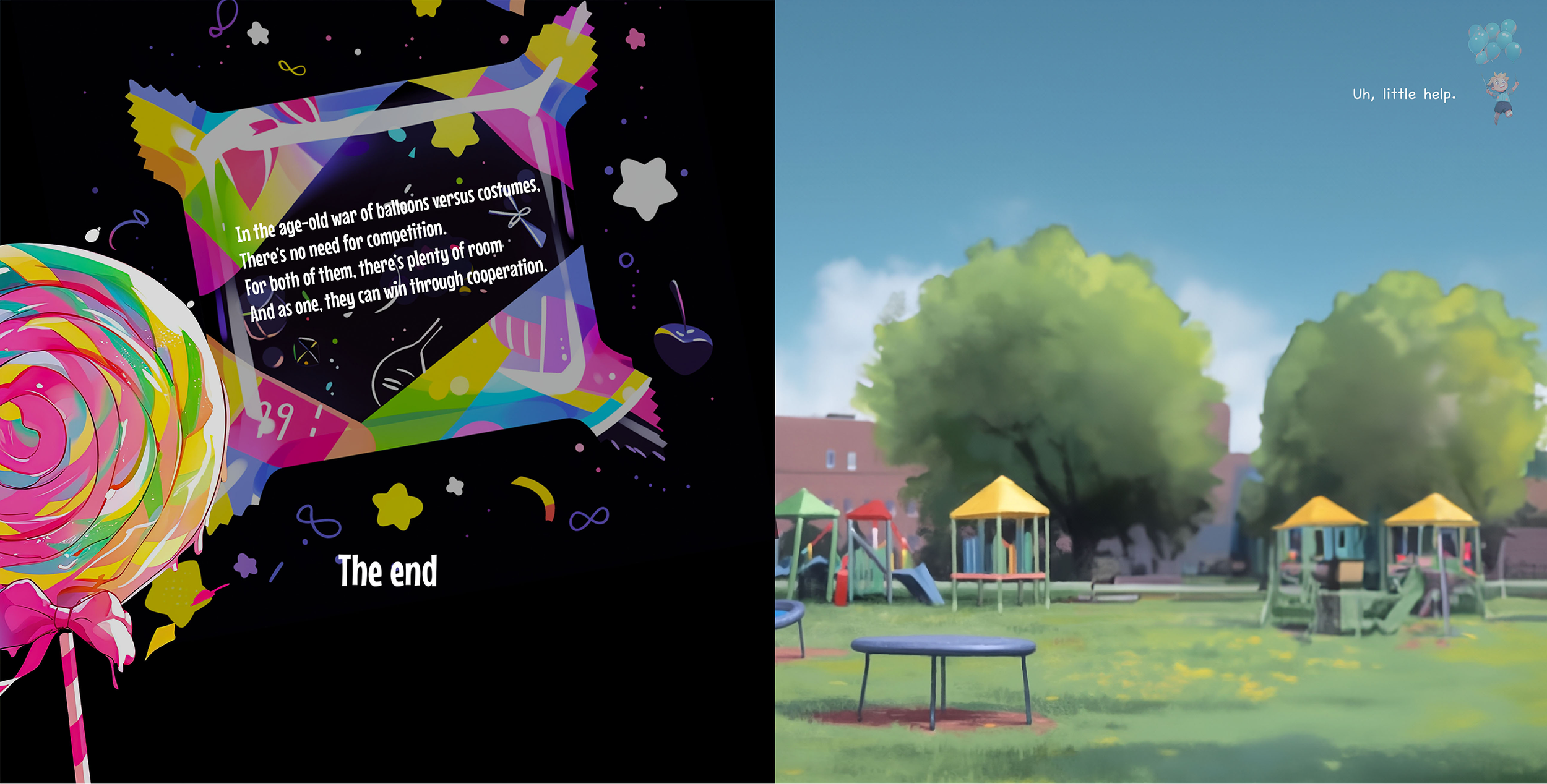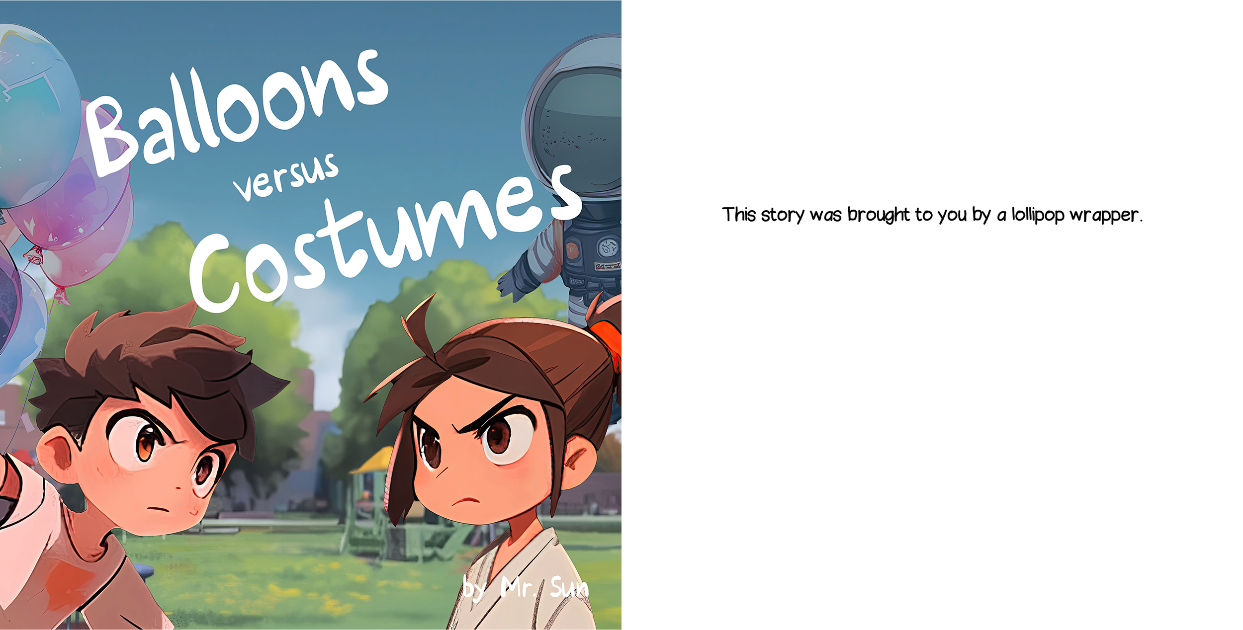 After evaluating both the limitations and the capabilities of AI, I chose to fully rewrite some of the books. Balloons Versus Costumes was originally a rhyming story, but with AI I reimagined it as a comic-book–style narrative.