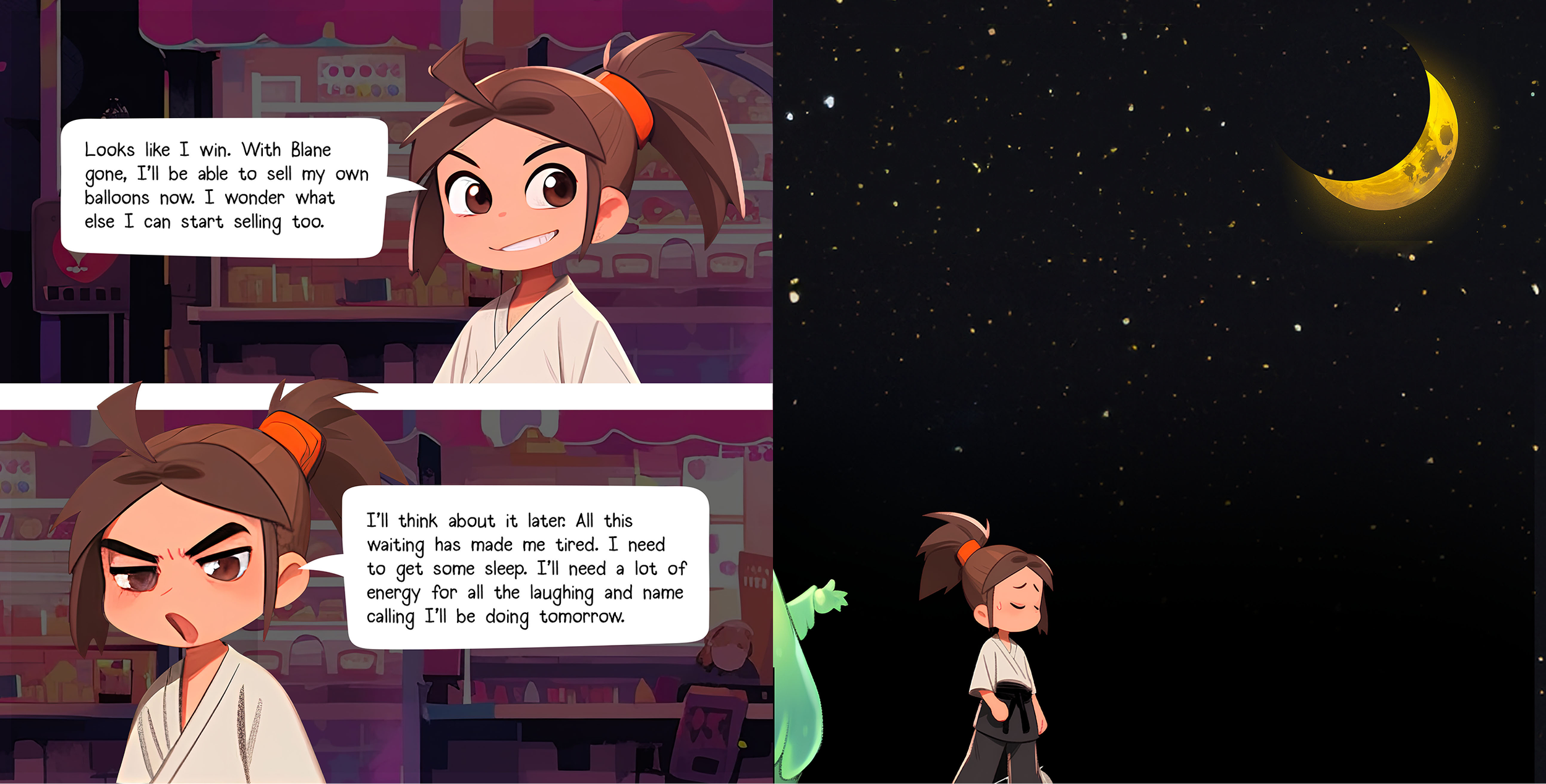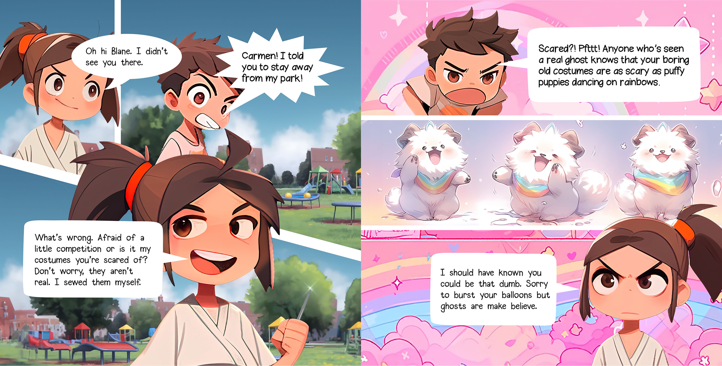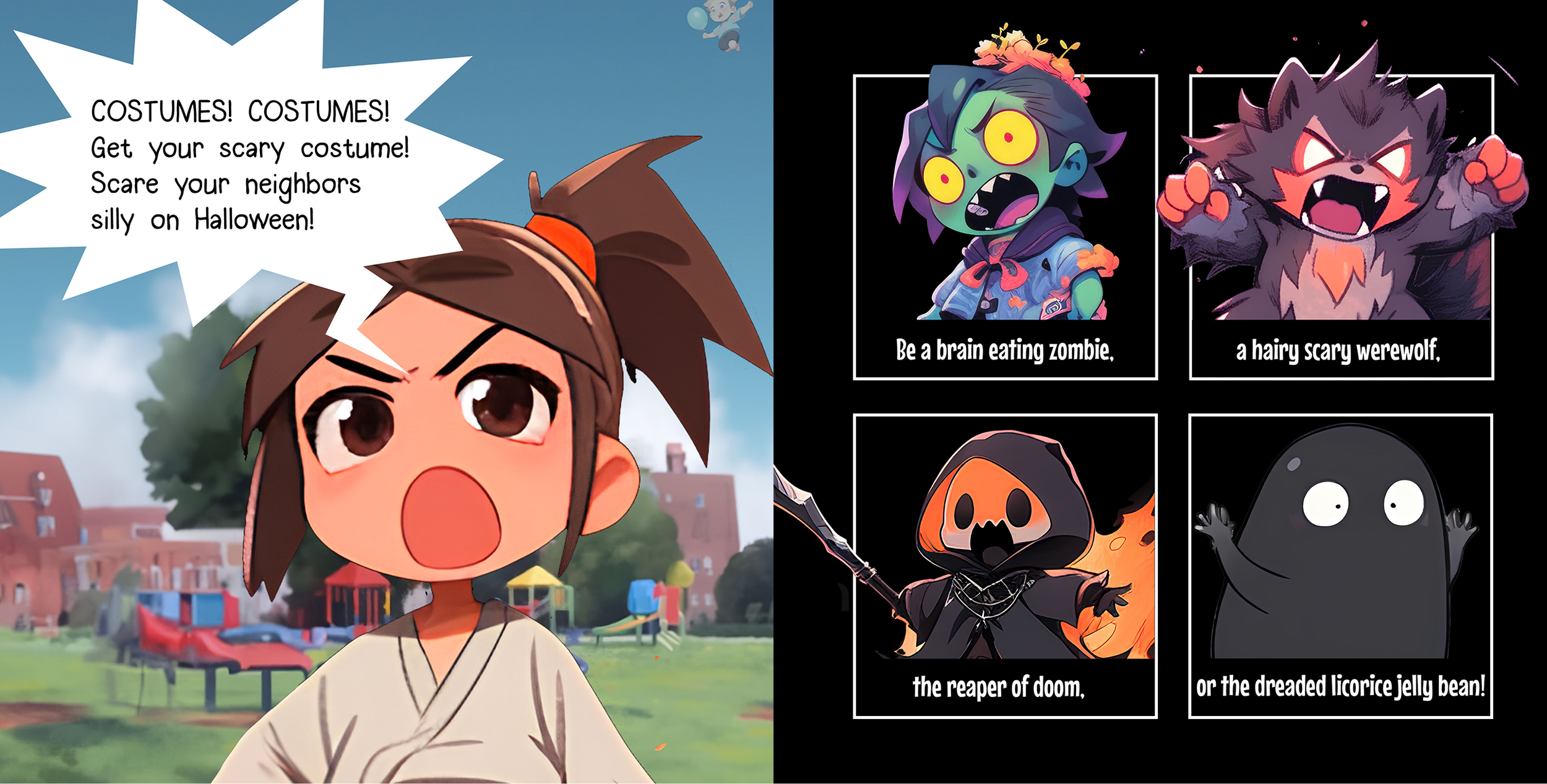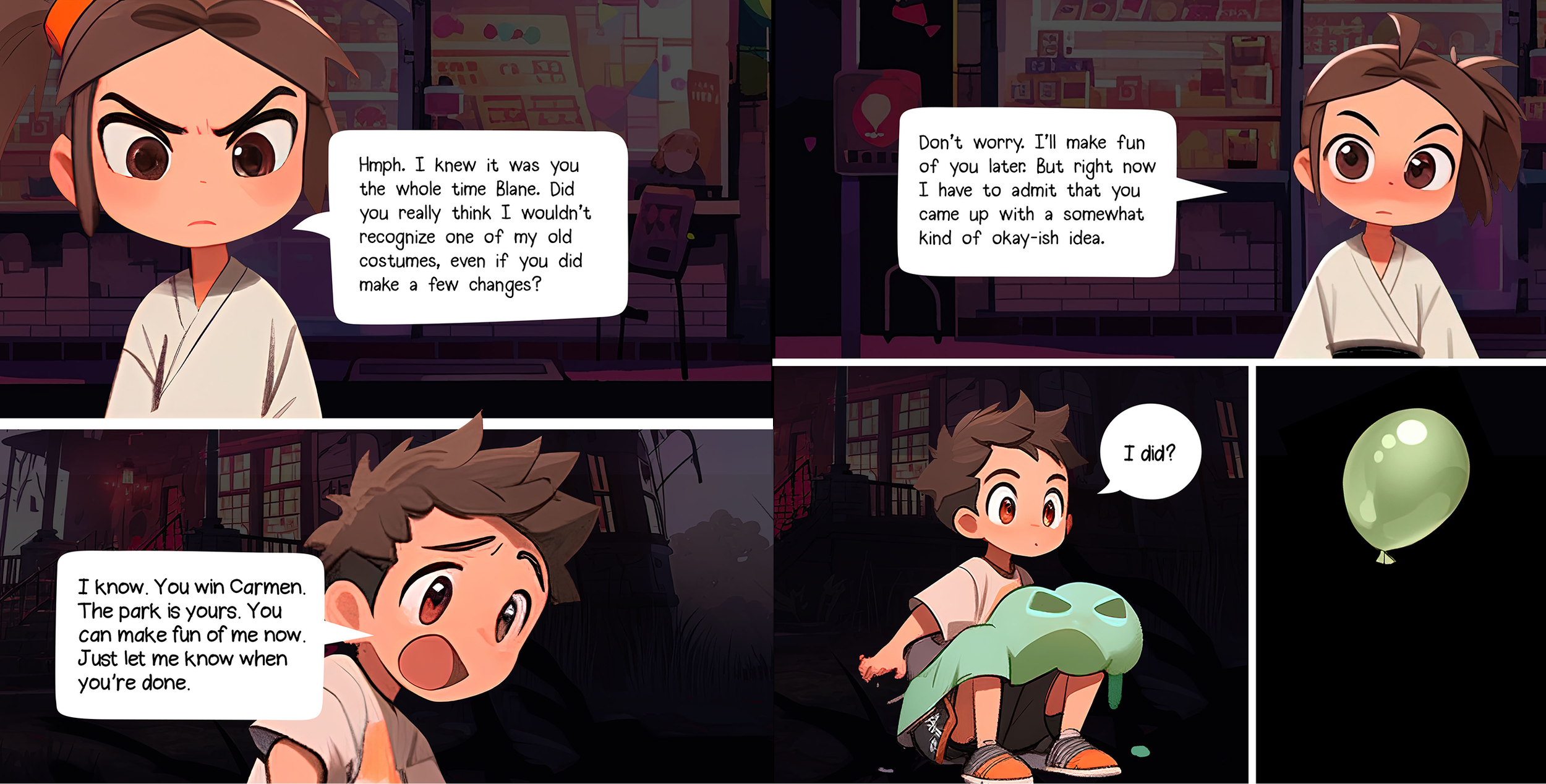 After evaluating both the limitations and the capabilities of AI, I chose to fully rewrite some of the books. Balloons Versus Costumes was originally a rhyming story, but with AI I reimagined it as a comic-book–style narrative.