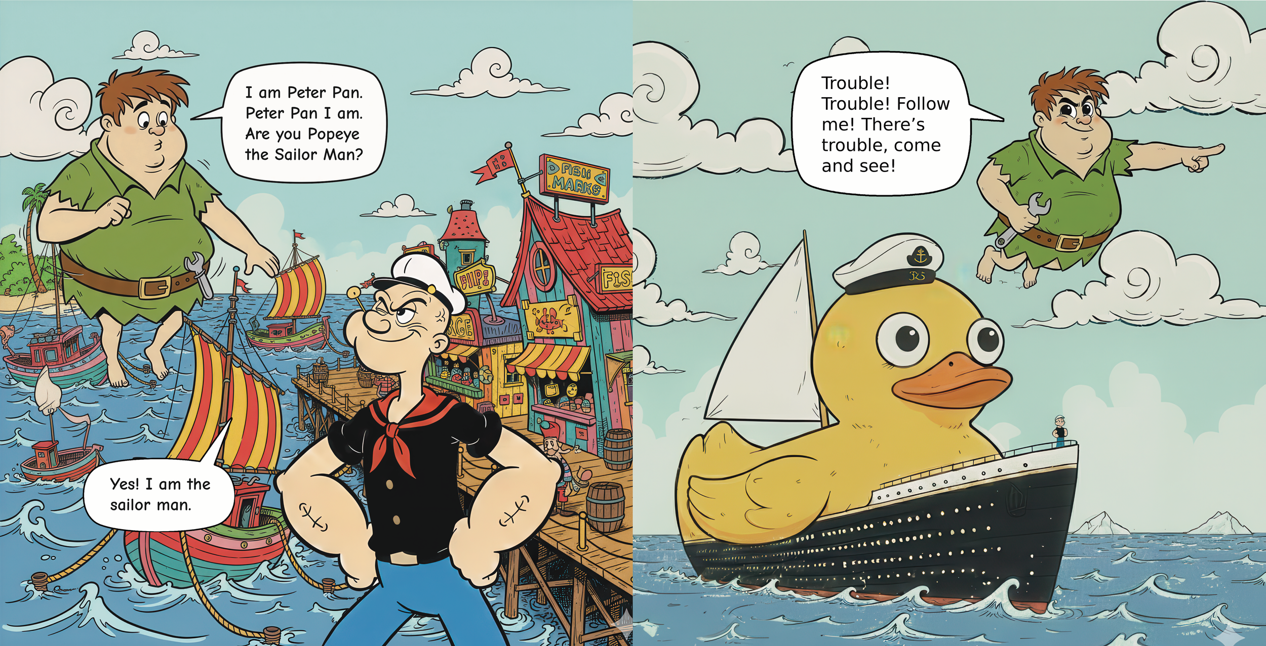 Are you Popeye the sailor man?Trouble! Trouble! Follow me! There’s trouble—come and see!